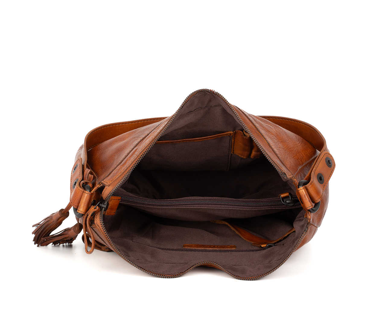 Díky svému modernímu vzhledu a propracovaným detailům je tato kožená kabelka přes rameno „Natalia“ v barvě brandy skutečným poutačem. Design se vyznačuje diagonálními liniemi v kůži , které vytvářejí dynamický a moderní vzhled. Kožený střapec na boku kabelky dodává hravý ženský nádech. Poddajná kůže je pohodlná na dotek a časem získává krásný, jedinečný charakter. Díky své praktické velikosti nabízí Natalia dostatek prostoru pro vaše každodenní nezbytnosti a je ideální pro každodenní nošení.