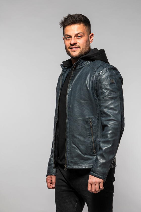 Tmavě modrá kožená pánská bunda s textilní kapucí MMRyxo DB DBlue